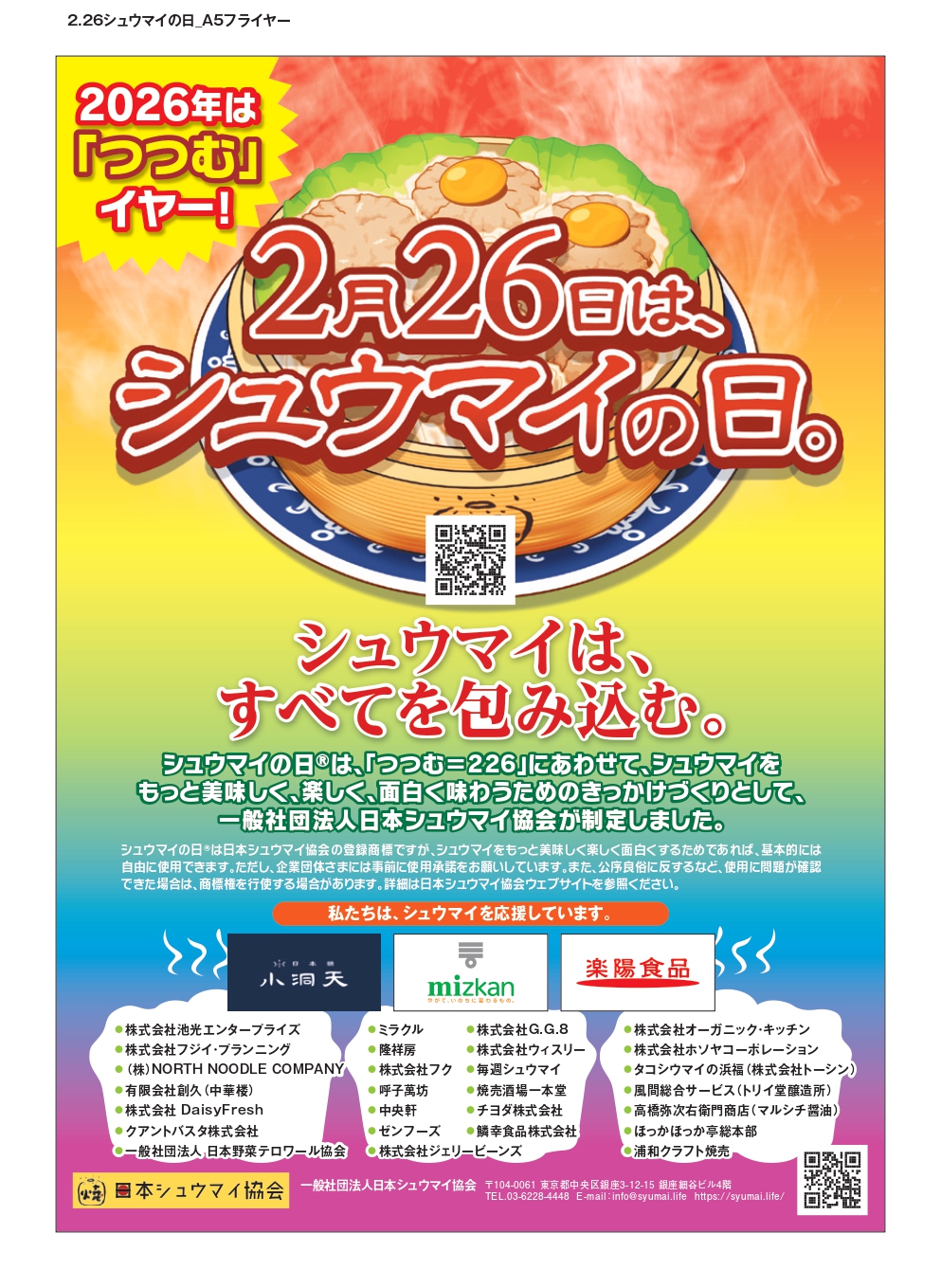 「シュウマイの日」は、一般社団法人日本シュウマイ協会が制定した記念日です。 「つつむ=226(2月26日)」にちなみ、シュウマイをもっと美味しく、楽しく、面白く味わっていただくきっかけとして設けられました。 当社もシュウマイを応援する企業として、この趣旨に賛同しております。 なお、「シュウマイの日」は同協会の登録商標です。 企業・団体での使用にあたっては、事前の使用承諾が必要となります。 詳細につきましては、一般社団法人日本シュウマイ協会のウェブサイトをご参照ください。